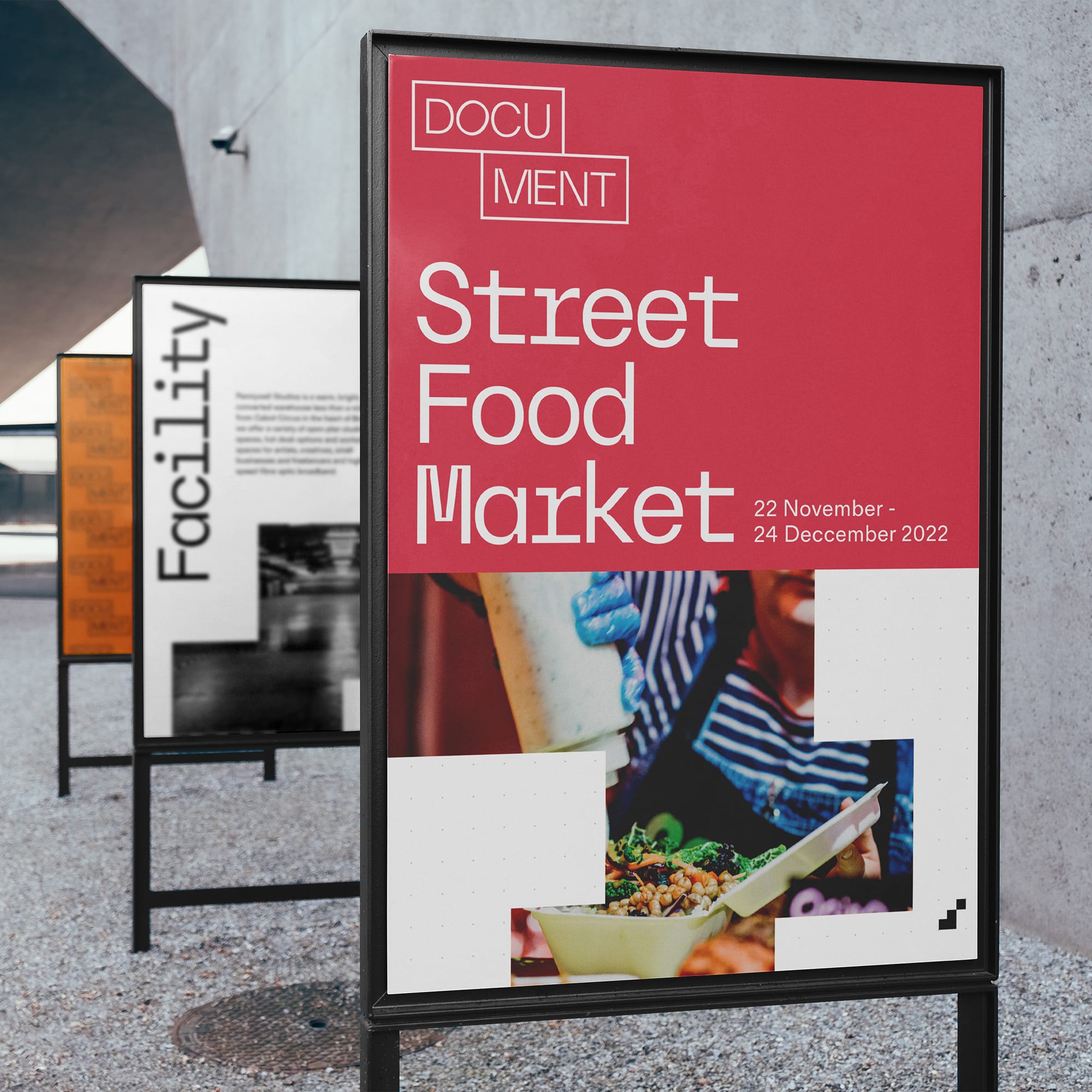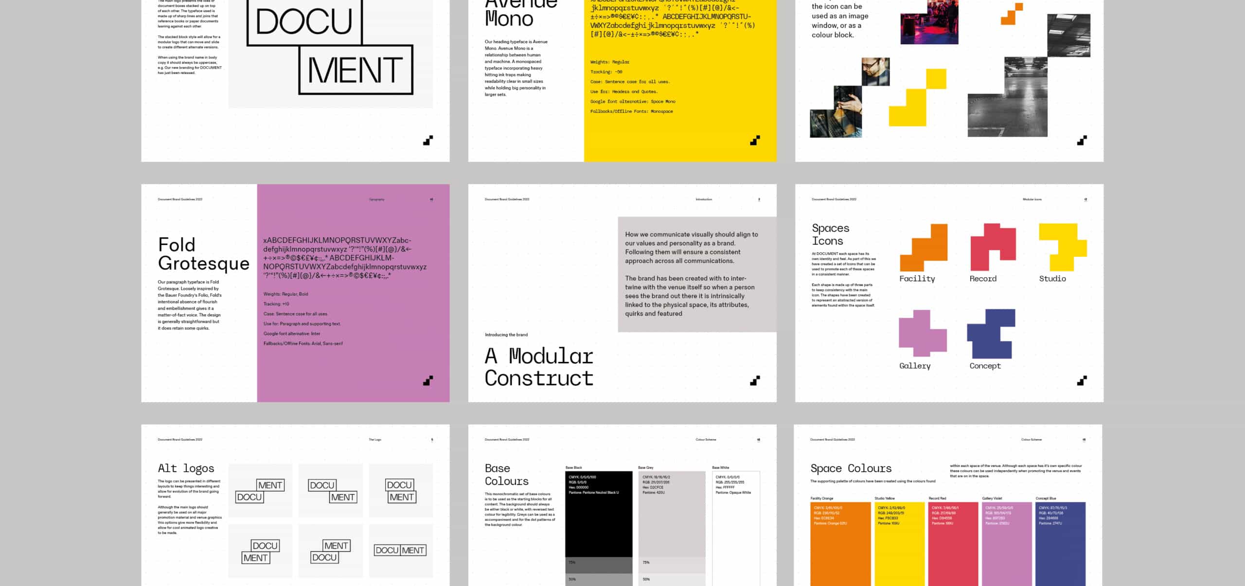 We devised the naming properties for each space based on the history of the venue and their current format. The spaces in DOCUMENT vary from massive blank canvasses used for large scale events through to open plan co-working spaces, and temporary office spaces. Each space’s sub-brand took aspects from each space to build up the modular icon and colour assigned to the individual spaces. This allowed us to target sectors and potential clients with a consistent branded look and feel.